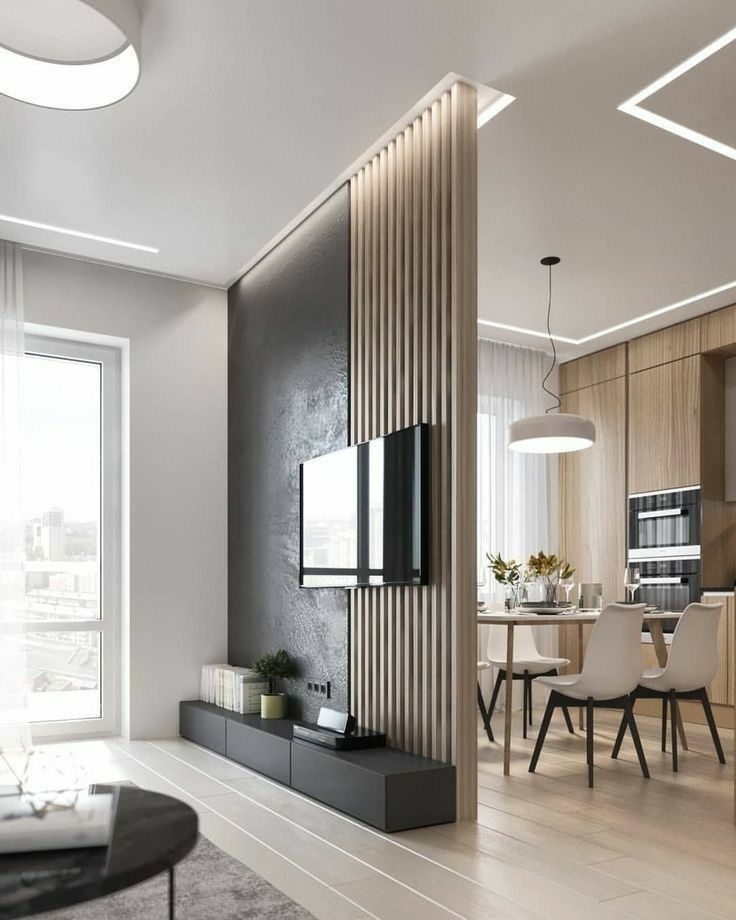Gunakan kayu yang telah melapisi PVC untuk menguatkan kesan klasik. Bahan kayu aman untuk dipasangi TV. Kombinasikan dengan meja kecil untuk menyimpan hiasan ruangan atau buku. Kombinasi warna coklat dan coklat susu bisa menjadi pilihan tepat untuk partisi dapur dan ruang tengah.